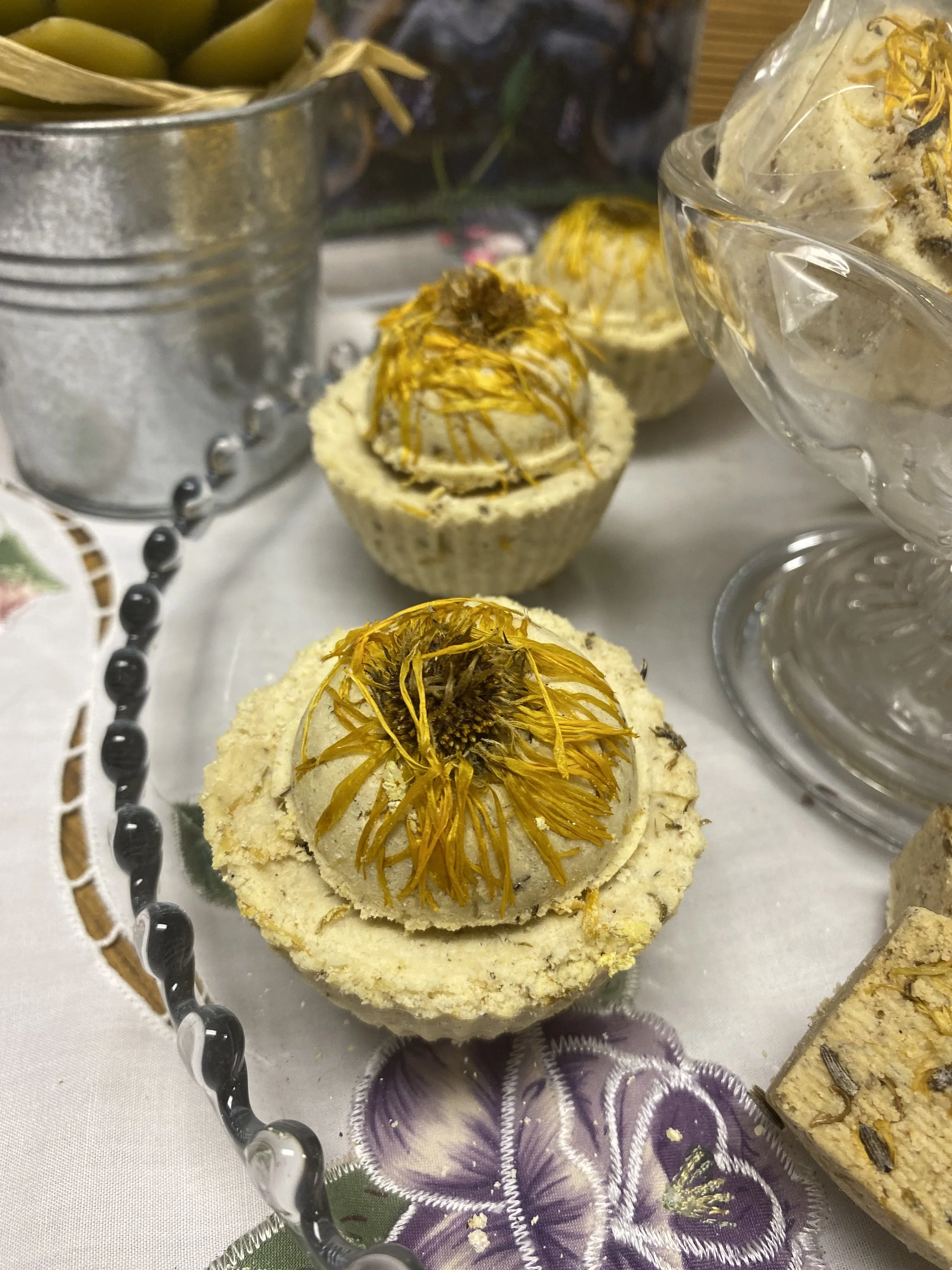 Each herbaceous bath melt scrub has been infused with Cariñosas garden herbs and flowers and a combination of aromatic and beneficial essential oils.
